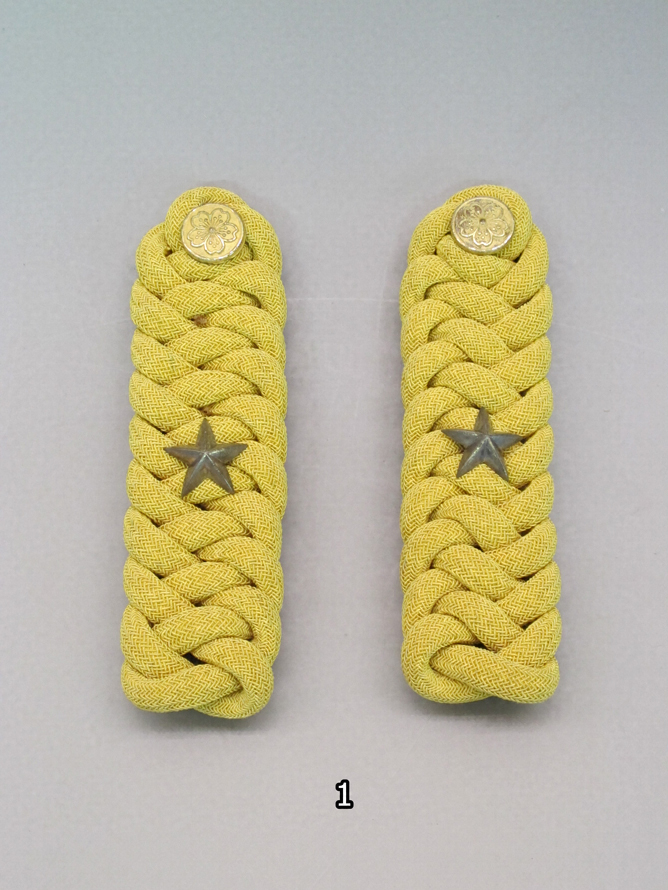 【1】は黄色の紐を編み込んで成形したものに星が1つ付いた、正装・礼装用の正肩章。端には桜の紋章のボタンが付いている。