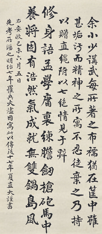 10代佐賀藩主鍋島直正(1814~70)は隠居の前年にあたる万延元年(1860)、嫡男直大(なおひろ)に詩書を書き与えた。それが明治7年(1874)の佐賀の乱により焼失したことから、直大は後世に伝えるため明治17年夏に同詩を書したが、直大筆の書幅も現存していない。現存する本資料は、直大筆の書幅を、のちに旧佐賀藩士の相良頼善が転写したものである。
