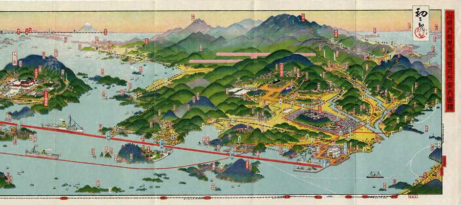 三津浜に本社を置く石崎汽船の航路を、松山、大三島、尾道の様子などとあわせて描いた絵図。松山には松山城や道後温泉が、大三島には大山祇神社が、尾道には千光寺などの観光地が描かれている。三津浜の本社、松山〜尾道の航路、汽船は、特に大きく太く描き、石崎汽船を宣伝している。