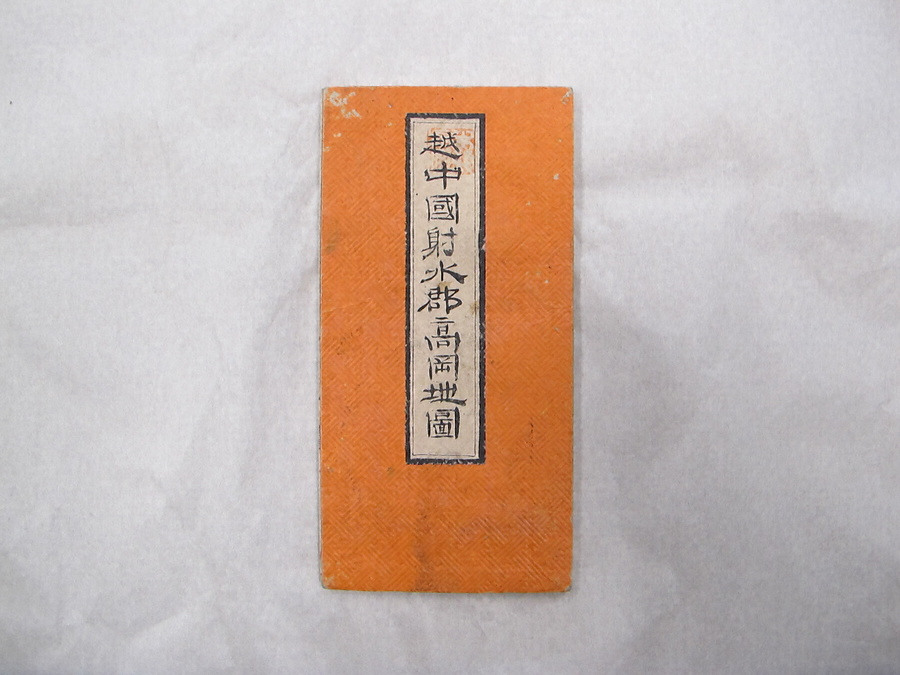 折り畳み式で橙色の表紙と裏表紙がある。表紙中央部には題箋が貼られ、縦書きで「越中國射水郡髙岡地圖」と旧字で墨書されており、文字全体を印刷された黒枠で囲んでいる。「越」の上に白文方印「柳處」が捺されている。同じ印は展開時の本図の右上と左下にも捺されている。加えて、左下の印には、上から白文円印(印文不明)が捺されている。おそらく、本資料の所蔵者と思われる。