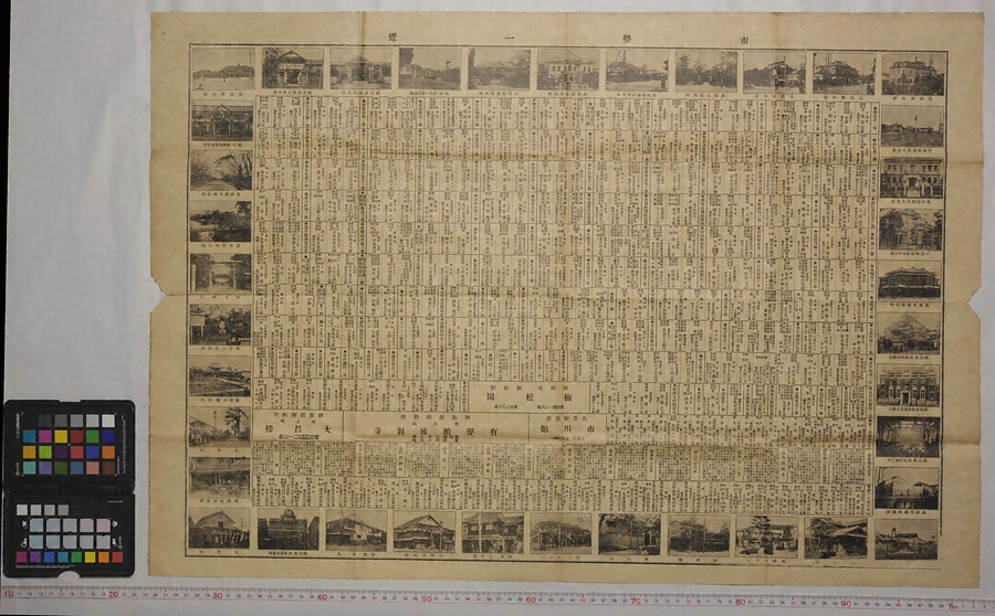 資料裏には「市勢一覧」が示されている。「市勢一覧」の周囲には市内の様々な施設として「高岡市役所」「中越鉄道株式會社」「高岡電燈株式會社」「日清紡績高岡分工場」「高岡米穀取引所」「株式會社高岡共立銀行」「株式會社高岡鉄工所」「高岡可鍛鋳鉄所」「松林亭」「高岡ホテル」「木津楼」「大昌楼」「旅館山岸屋」「旅館吉野館」「佐野又旅館」「旅館角久」「株式會社高岡電気館」「大黒座」「南理化研究所」「七本杉」「高岡山瑞龍寺」「孝子六兵衛碑」「射水神社」「高岡古城公園」「高岡櫻馬場公園」「縣立高岡高等女學校」「高岡停車場」「縣立高岡工芸學校」「縣立高岡中學校」「縣立高岡工業試験場」「高岡物産陳列所」「高岡商業會議所」「高岡聯隊区司令部」「高岡区裁判所」「高岡税務署」「高岡警察署」の写真が掲載されている。