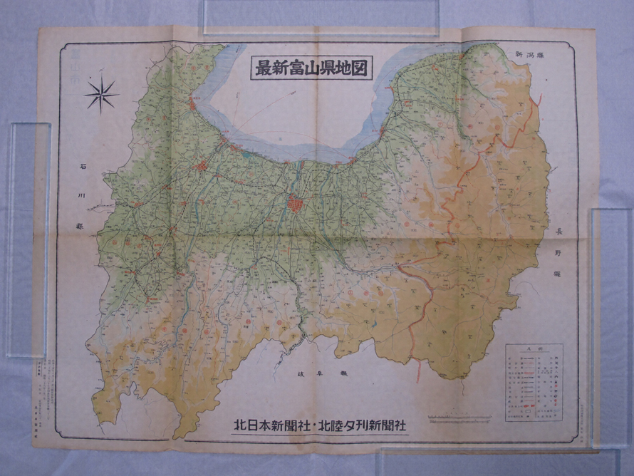 表面は富山県全体の地図で、平野部は緑、山間部は黄色などというように6色カラー印刷によって色分けがされている。上部中央に「最新富山県地図」、下部中央に「北日本新聞社・北陸夕刊新聞社」の文字があり、右下には縮尺と凡例一覧が載っている。また、欄外の左下には「昭和十五年八月三日 第三種郵便物認可/昭和二十四年二月二十七日国鉄特別扱新聞紙二十三号/発行日 昭和二十八年三月一日」「不許複製」「発行所 富山市安住町三十一番地 北日本新聞社」とあり、右下には「明治印刷株式会社 製版 印刷」とある。