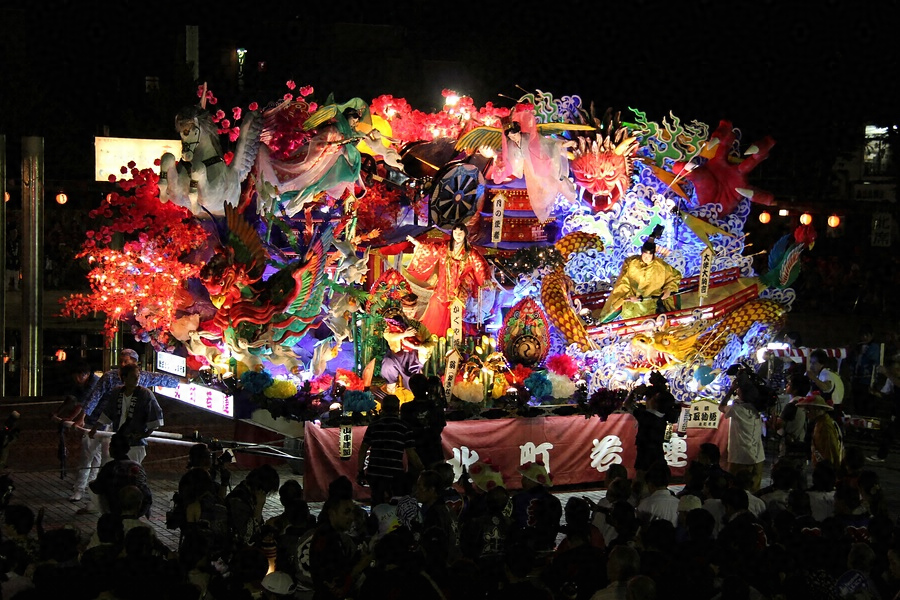山車は、歌舞伎や物語などに題材をとった作り物で飾られ、各町内の若者達により毎年造り替えられる。当日は自分の町内を出発した後、天満神社のある最上公園に集合して順に市内を巡行するが、山車につく囃子は周辺部の農村の若者が受け持っている。