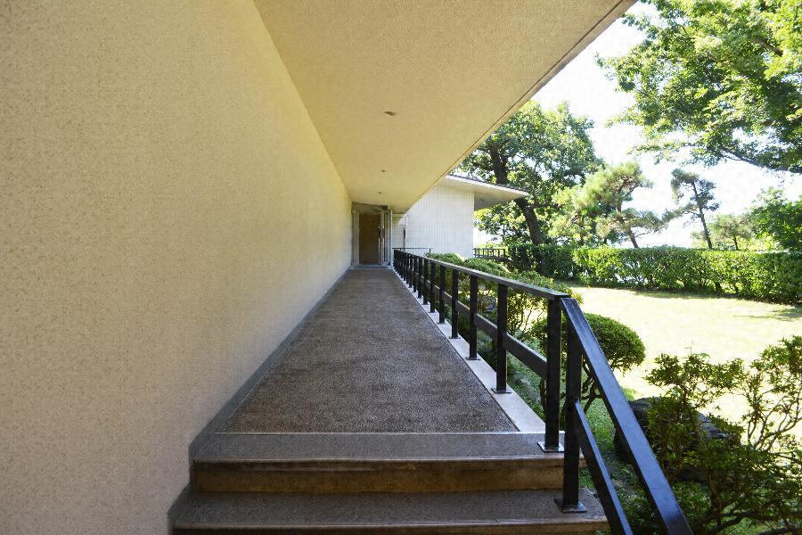 管理棟と展示棟を結ぶ回廊。南側に壁を建て、片持状に床と屋根を張り出す。両棟と相まって庭を画するのみならず、展示棟を聖なる世界に見立て、その媒介としての強い意義を与えられていたと伝えられ、記念館全体の空間構成を有機的にまとめる建物である。