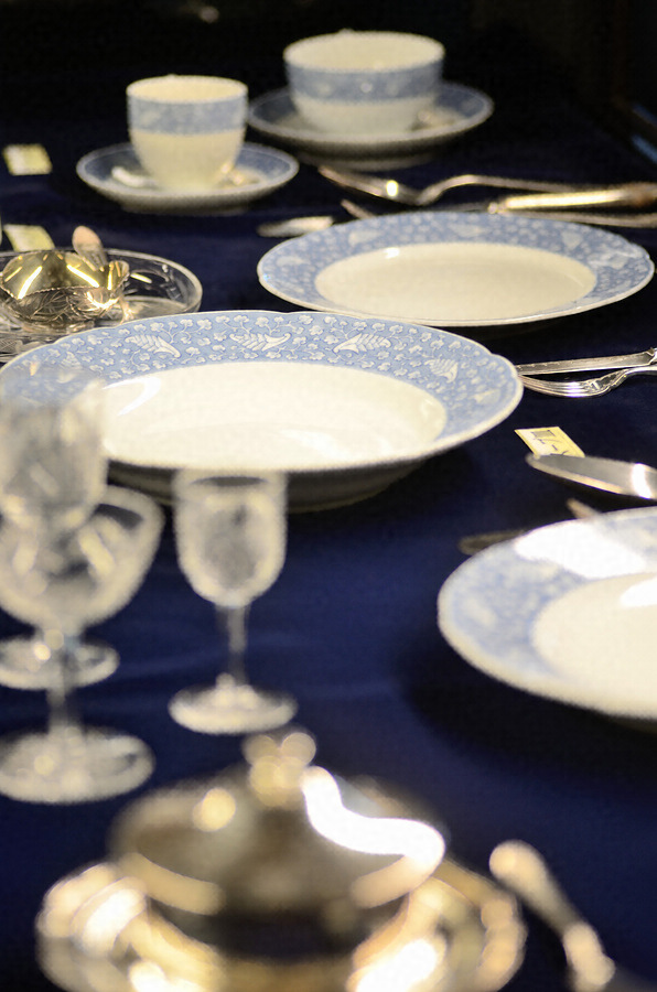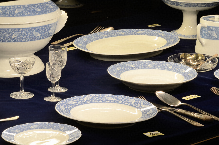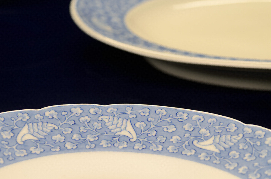 侯爵(旧佐賀藩主)鍋島家の家紋である杏葉紋を散らした鍋島家特注の洋食器セット。佐賀県有田町の老舗磁器メーカー香蘭社で製作された。それぞれの縁には帯状の染付に白抜きで杏葉紋を図案化して散らした唐草模様を表す。