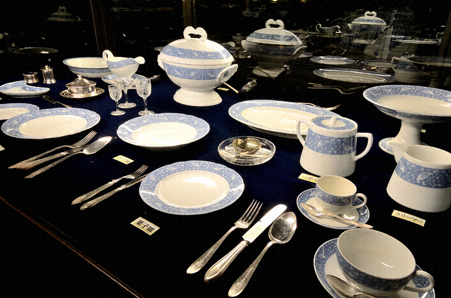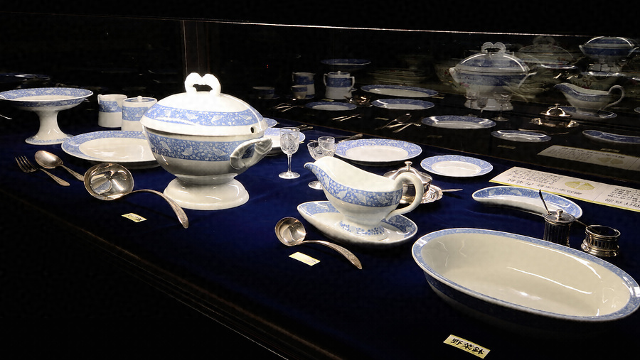 関東大震災以後、侯爵鍋島家の本邸となった渋谷松濤の鍋島邸にて使用されていたもの。現存するだけでも肉皿は106枚あり、家紋入りの銀器やガラス器と共に大人数の食卓を彩ったであろう。