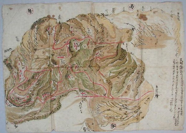 北山形県村は、現在の福島県県石川郡石川町大字北山形県にあたる地域に、江戸時代から明治二十二年まであった村名である。この村は、当初会津藩領であったのが、寛永四(1627)年に白河藩領となり、次いで寛保元(1741)年には越後高田藩領、そして文化六(1809)年に幕府領となって明治維新を迎えた。この絵図は、天明二(1782)年に榊原式部大輔の御中老役鈴木半兵衛へ差し上げたものの控えを翌年写したもの。