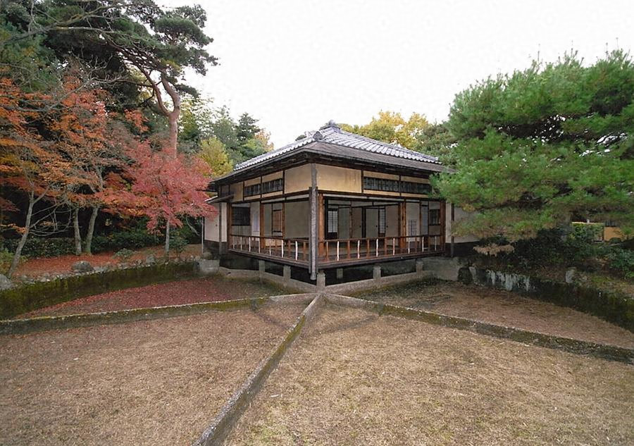 広大な敷地の中央に建つ本館は,庭園に面して大書院棟や中書院棟などを並べた大規模建築で,本館の周囲には大小の茶室群などを配置する。いずれの建物も,高谷の説く方円思想における象徴的図形である方形と円形を用いた独創的な意匠でまとめており,独自の茶の湯の空間を創出している。
