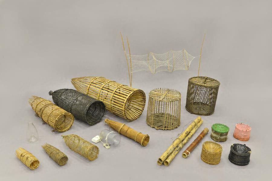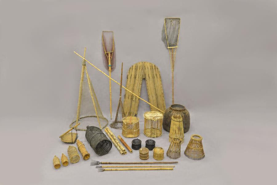 漁撈用具は,陥穽漁,定置漁,網漁,釣漁,突漁,伏せ漁,貝曳漁等の漁撈に直接使う用具のほか,船や船具,漁撈用具を製作・修理する用具,魚介類の加工や運搬の用具,仕事着等もある。エリと呼ばれる定置漁の用具のほか,魚種ごとに多様な形態を持つ筌,アユを生かしたまま捕獲・運搬する用具類,近代以降の淡水真珠の養殖用具等,地域的特色があるものが多い。