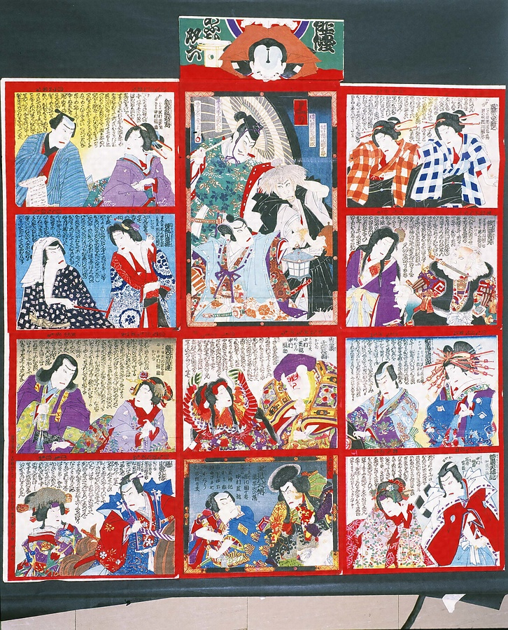 11の狂言を取り上げた双六。振り出しが八犬伝で、円塚山の場。市村座で上演した「里見八犬伝」の役者絵で、道節は市川団十郎、荘助は中村芝翫。
