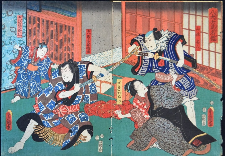 行徳古那屋で小文吾に喧嘩をしかける房八と、止めに入るお縫。親兵衛もいる。