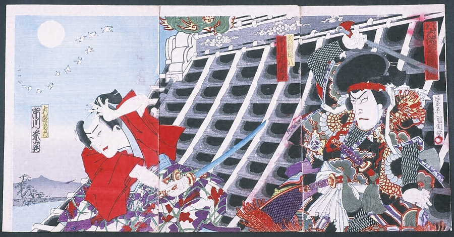 役者見立絵。信乃(市川米蔵)と現八(市川左団次)の芳流閣屋根上の決闘。