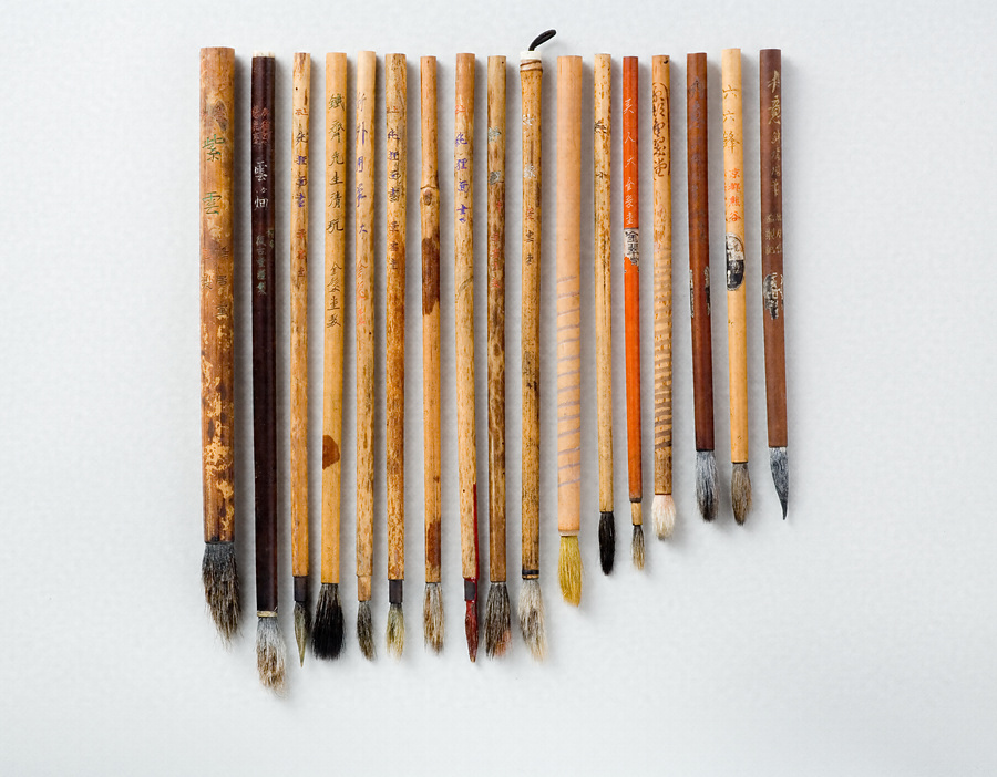 富岡鉄斎(一八三六~一九二四)は日本近代の画家。東洋的な教養に通じ、「最後の文人」と呼ばれた巨匠である。 本筆はいずれも穂首が荒れているが、これは同じく鉄斎の用筆を所蔵する鉄斎美術館のものと共通しており、鉄斎の筆はほとんどがこのような筆であったらしい。また筆管の汚れ具合も凄まじく、墨をはね散らしながらもそのような事は気にも留めず、一心不乱に絵を描き続ける老巨匠の制作風景を彷彿とさせる。鉄斎の孫、富岡益太郎から譲られてコレクションに加わった珍品である。