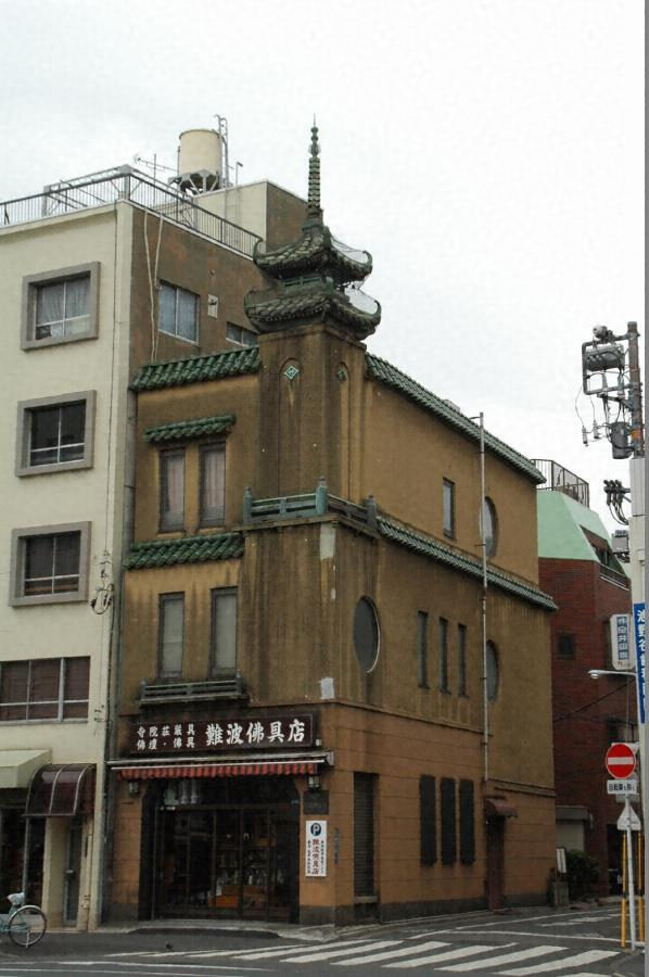 浅草通りに面する角地に建つ。鉄筋コンクリート造で一階を店舗、地下一階と二階を倉庫、三階を居室とする。外壁は色モルタル塗で、縦長窓と丸窓を開き、緑色の瓦や高欄を廻し意匠性に富む。塔屋は反りの強い屋根を二重に架け、独創的な外観を形成している。