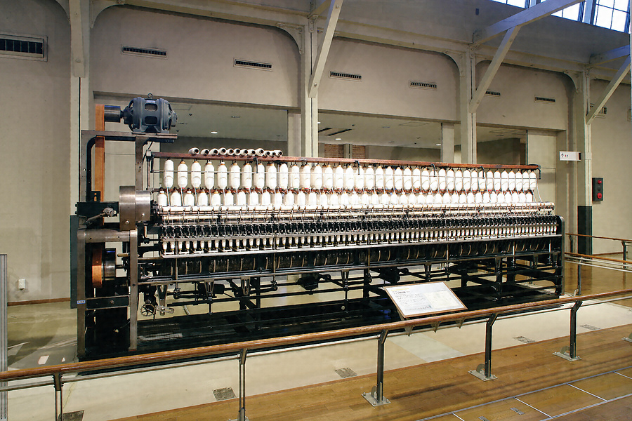 リング精紡機は1828年アメリカで発明されました。粗糸をドラフトローラへ供給し、細く引き伸ばし、リングとトラベラによって撚りをかけ、完成した糸をボビンに巻き取ります。当初、ミュール精紡機やスロッスル精紡機が輸入されましたが、1890年代になると能率の良いリング精紡機に移行していきます。