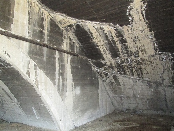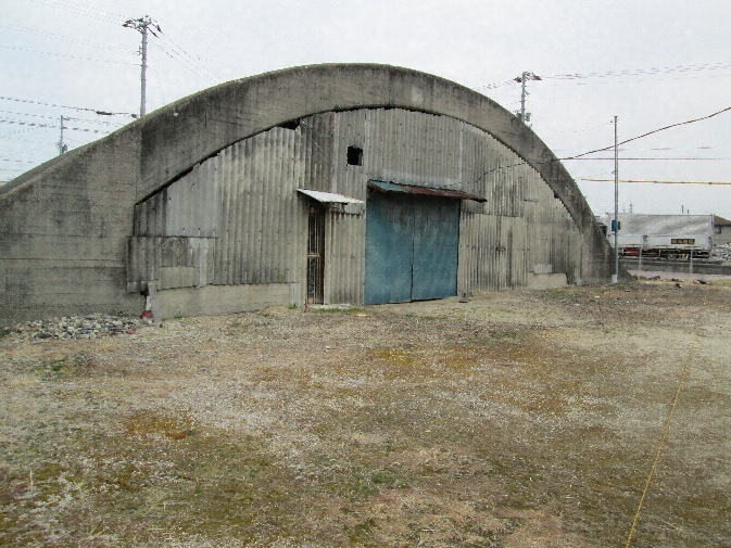 コンクリート造の構造物。主翼格納部の前部アーチと尾翼格納部の後部アーチの大小2つのカマボコ型アーチを合わせた形態。