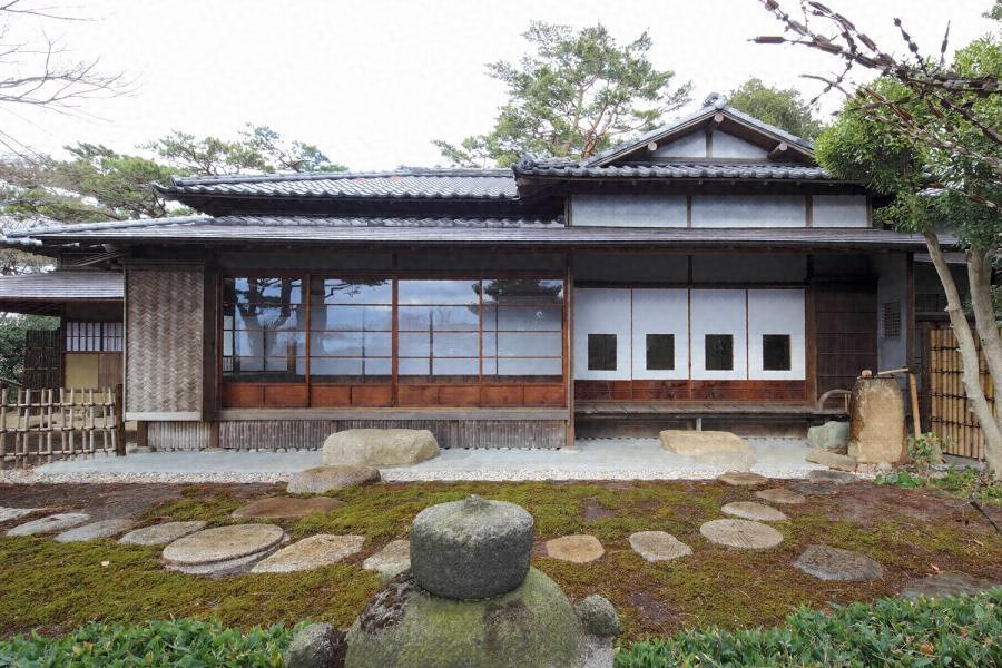 政治家田健次郎が東宮行啓のため作った茶室は、玄関、寄付と次の間を介した広間と八畳からなる。広間は天井を折上げ、広縁には付書院を設け、格式を高めた近代の書院建築。五島慶太による増築部は、四畳台目で、高台寺旧小方丈茶室を写した近代茶室の好例。