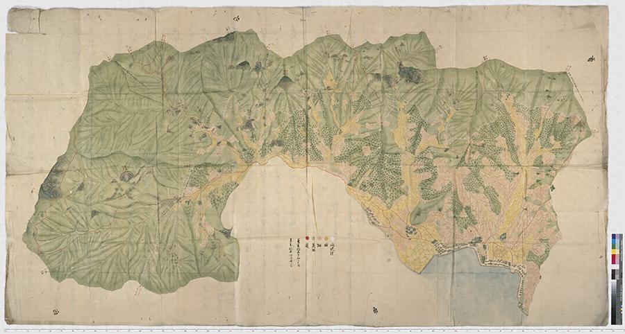 宇和島藩領の東山田村・野田村・伊賀上村(愛媛県西予市)と吉田藩領の俵津浦(愛媛県西予市)との間で起きた山をめぐる境界争論を裁定した絵図。文化10年(1813)に宇和島藩の測量技術者、小川五郎兵衛(久忠)が藩により俵津浦を測量して絵図に仕立てているが、本図も小川がその測量成果をもとに作製したものといえよう。山側に複雑に折れ曲る白線が見えるが、この白線が3カ村側の主張する村境。一方、俵津浦は絵図に描かれている範囲の全体を村域と主張しており、両者の認識には大きな隔たりがあった。そこで、白線から上側をいずれにも属さない入会場とすることで、争論は決着をみている。裁決結果を記した絵図の裏書には、俵津浦と入会地との境界に248本の立石を設置し、5番目ごとの石に数字を刻んだことが記されている。本図には、複雑な境界を確定し、写実的な表現で絵図に記録した、五郎兵衛の高度な測量技術、絵図の作製能力が随所に見られる。