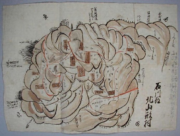 北山形県村は、現在の福島県県石川郡石川町大字北山形県にあたる地域に、江戸時代から明治二十二年まであった村名である。この村は、当初会津藩領であったのが、寛永四(1627)年に白河藩領となり、次いで寛保元(1741)年には越後高田藩領、そして文化六(1809)年に幕府領となって明治維新を迎えた。この絵図は文化七(1810)年のもので、越後高田藩領から幕府領へとかわった直後のようすがうかがえる。