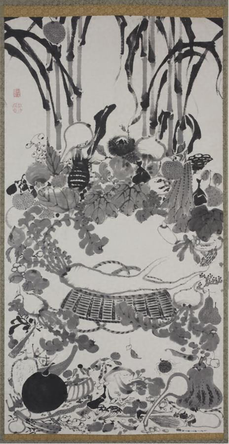伊藤若冲は江戸時代中期の京都で特異な画風をもって活躍した絵師。本図は種々の野菜や果物で涅槃の様子を表したもの。戯画の一種とも言えるが、錦小路の青物問屋の家に育った若冲の面目