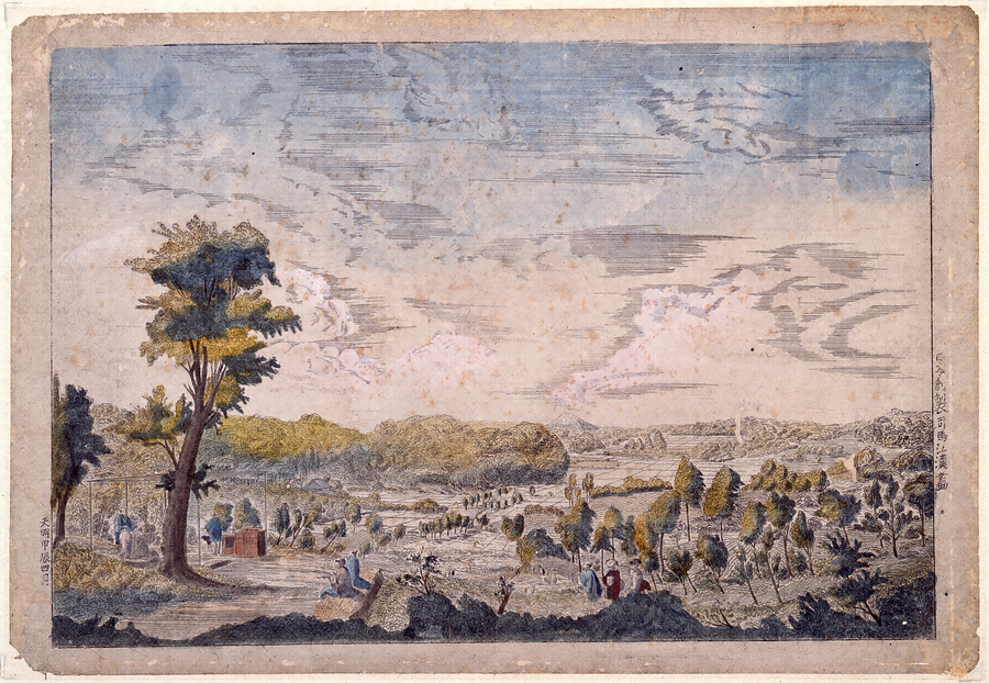 司馬江漢が天明年間(1781-1789)に制作した風景銅版画のひとつ。現在の喧騒ぶりからは想像がつきませんが、描かれているのは今の東京の広尾あたりで、広々とした武蔵野の田園に茶屋が一軒という、のどかな風景です。江漢は蘭学者の桂川甫周らをともなって広尾台の「老爺茶屋」で酒宴を開いたことがあり、画中の茶屋がそれに当たると思われます。この版画は反射式眼鏡絵として制作されたので左右反対の構図となっています。