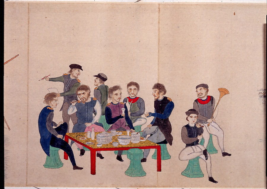 天保山沖に碇泊するロシア軍艦ディアナ号を描いた図です。画面中央の小高い丘が天保山で、左右はそれぞれ多くの和船が行き交う安治川口と木津川口。周囲の和船に比べ、ディアナ号の大きさが際立っています。本図巻では冒頭に「嘉永七甲寅歳九月十七日安治川口江魯西亜舩碇泊之事」と題する詞書、続いて本図とディアナ号の甲板上の様子を描いた図、ロシア人たちの宴席を描いた図の3図を載せます。作者は不明ですが、詞書に大坂城代土屋寅直の手勢以下の派兵状況、ロシア船の規模、ロシア側の要求など詳細な記載があることから、交渉を担った大坂町奉行に近い人物が想定されます。彼らは、西欧諸国では4隻で1艦隊を編成するという知識を有しており、一隻で来航したロシア使節に対し、艦隊を編成する友船の有無を尋ねています。これに対するロシア側からの回答はなく、また紀州沖に最大8~9隻の異国船が来航しているとの情報もあったことから、彼らは大坂湾外に友船が存在することを前提に初期の交渉に臨むことになります。