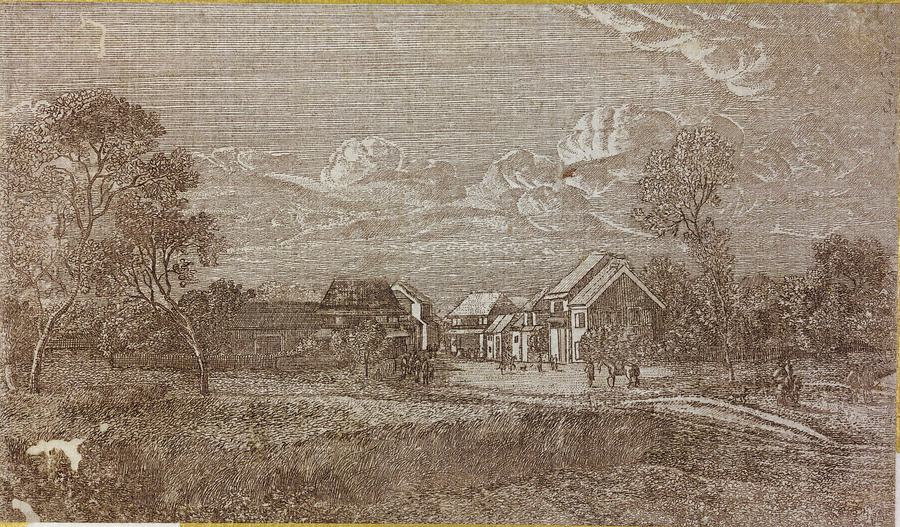 安田雷洲(生没年不詳)は、文化から安政にかけての幕末期に活躍した洋風画家です。その作品には幾つかの銅版風景画シリーズがあり、中でもこの「江戸近国風景」は最も完成度の高いものである。湧雲がまばゆく輝く空の下、重厚に描かれた山裾や河川などが複雑に重なり合い、小画面の作品とは思えぬ雄大な眺めが展開されます。その所々に人々の生活や建物が微小ながらも極めて精緻に描写されており、この作品のリアリティーを更に確固としたものにしています。このような充実した作風は従来の江漢や田善の風景画にはみられなかったもので、ここに日本の風景を描く洋風表現が全く新たな段階に入ったことを物語ります。