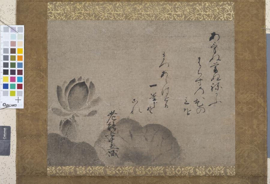 紙本墨画蓮図(能阿弥筆/自詠和歌及七十五歳の款記がある)