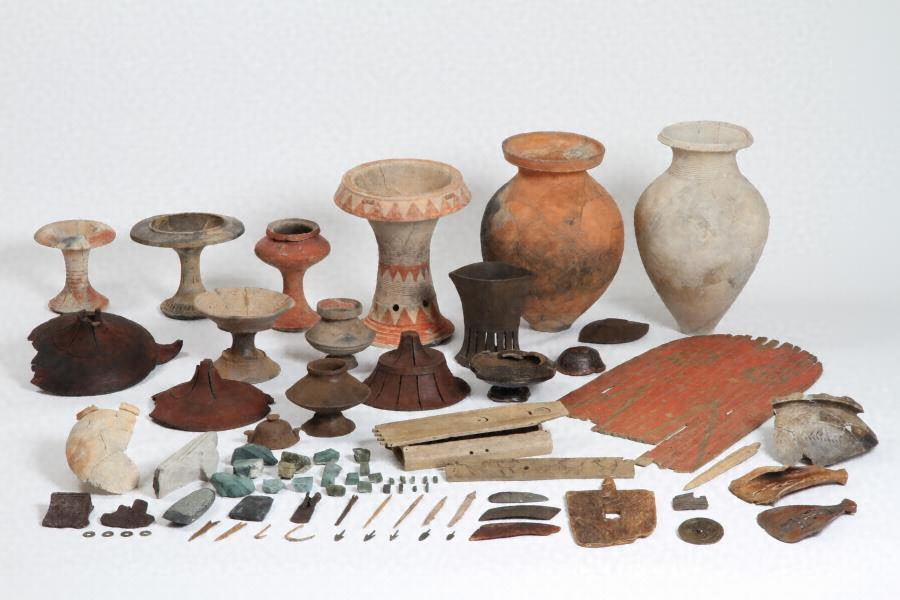 日本海を介した交易で栄えた集落跡の出土品。弥生時代の様々な遺物が出土し“弥生の博物館”とも言われる。なかでも主な交易品であった木製容器は精巧で、きわめて装飾性が高い。また、魚(サメ)や船団を描いた絵画資料は当地と海との深い繫がりを示す。