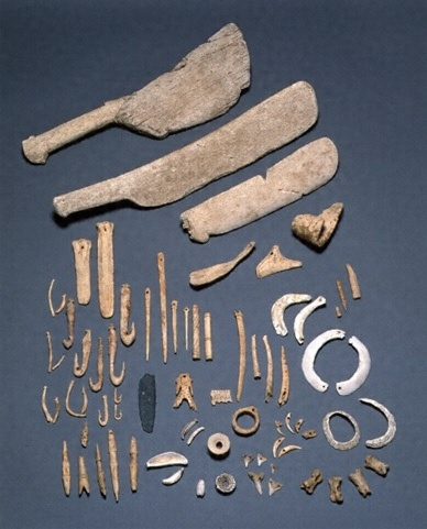 出土した骨角器には,主にエゾシカ角製の大小の精巧な釣り針・銛先などや,クジラ骨製の青竜刀形骨器・骨刀・剣形骨器などの他,エゾシカの角根部から作られた人形の角偶がある。