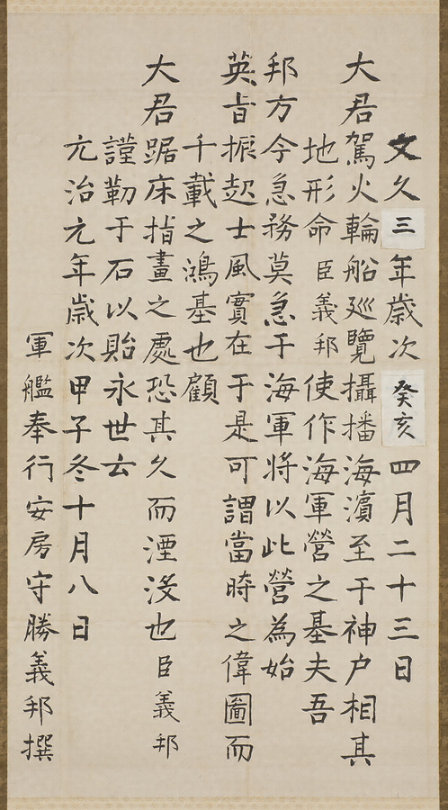 元治元年(1864)10月8日、軍艦奉行勝海舟が神戸海軍操練所の建設を記念して、操練所の敷地内に立てた碑文の稿本。海舟は操練所の開所にあわせて同年5月に軍艦奉行並から軍艦奉行に昇格しています。しかし同年7月、尊皇攘夷派勢力の回復を画策する長州藩によって禁門の変が引き起こされると、10月には神戸海軍操練所のトップにあった軍艦奉行勝海舟がこの事件に関連して罷免され、さらに翌2年3月12日には開所から1年足らずで海軍操練所自体が閉鎖されることになります。海舟は文久から元治期にかけて奥平野村祥福寺の西にあった神戸村庄屋生島四郎太夫の別邸に滞在しており、この碑文稿はその生島家に伝わったものです。碑そのものは操練所が閉鎖された際、幕府の追及を恐れて土中に埋められます。ですが後に掘り起こされて、大正4年(1915)11月に神戸港を見渡せる高台の諏訪山公園に再建され、現在も見ることができます。