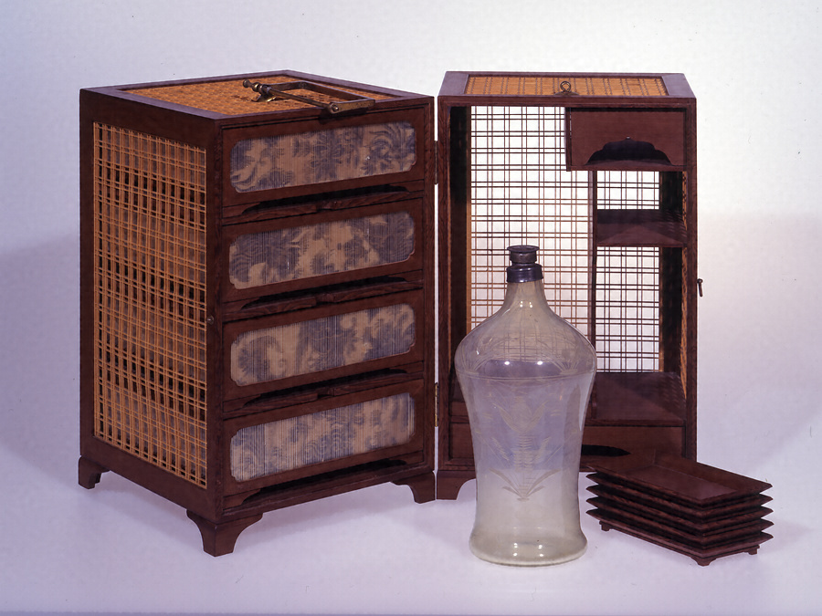 ガラス棒入り透かし絵提重、グラヴュール鷺文ガラス瓶子