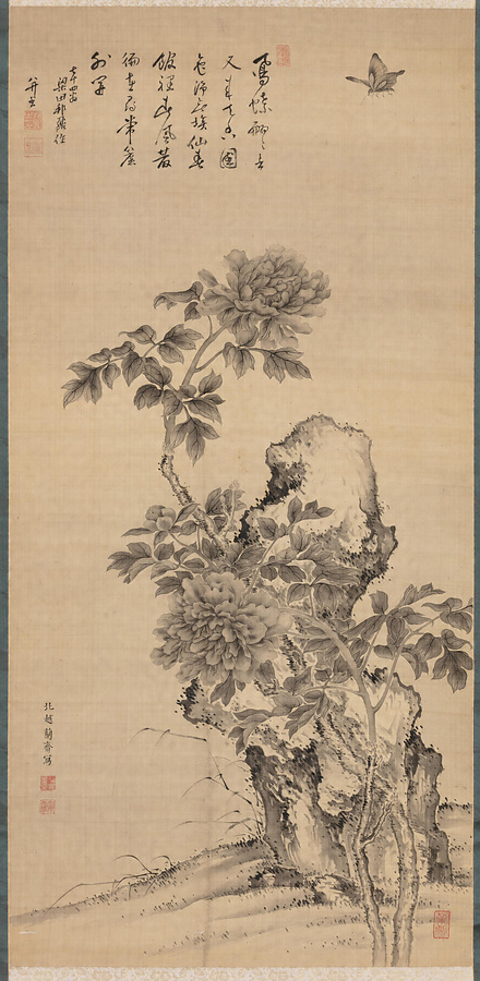 森蘭斎(1740-1801)は越後出身の絵師で、長崎で熊斐のもとで南蘋風の表現を学びました。熊斐の没後に大坂・江戸に移り、南蘋や熊斐の画業を伝える『蘭斎画譜』を刊行するなど、南蘋派の絵師の中でも広範な人脈をもっていた人物としても注目されます。本図は、蘭斎が江戸にいた晩年期の水墨画です。やや奔放な皴法・点苔で描かれた背景の岩とは対照的に、対の牡丹の葉や花びら、その上に舞う蝶は、精鋭な痩肥線と墨色の微妙な階調によって精緻な質感表現が施されています。画中に七言絶句は、明石藩の儒者・梁田象水によります。