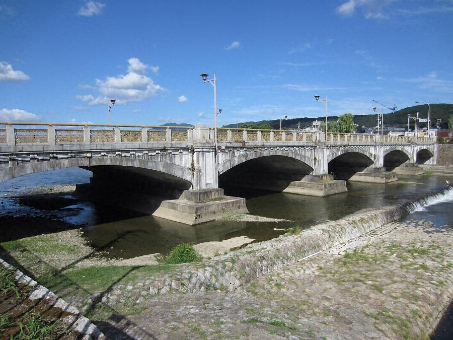 鴨川にかかる鉄筋コンクリート造五連アーチ橋で、重厚な橋脚と緩やかなアーチがリズミカルな立面を構成し、高欄親柱等のセセッション意匠も時代性をよく示す。明治末期の京都三大事業で鴨川にかけられた三橋で唯一現存し、古都の重要な景観要素となっている。