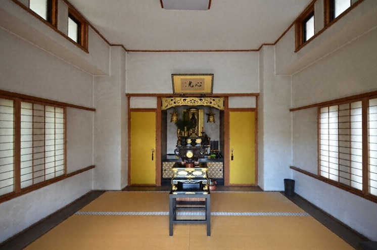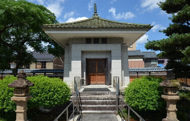 境内の北東隅に建つ宝形造で相輪を戴く。洗出しの基壇をもち、南正面扉口を門形の枠で飾り、両側面は出窓状に壁面を張り出し縦長窓を開く。背面下屋の仏壇両脇から基壇内の納骨室に到る。正側面の高窓から、柔らかく外光を取込むなどの造形を試みている。