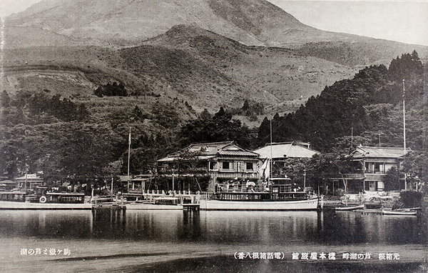 避暑客や観光客が芦ノ湖を訪れるようになると、中央の橋本屋をはじめ、元箱根にも旅館が開業しました。湖畔には複数の船が停泊していますが、遊覧船の姿もあることから、昭和に入ってから撮影されたものです。