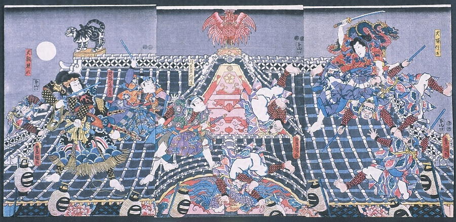 役者絵。嘉永5年(1852)市村座上演の際のものか。芳流閣屋根上の信乃と現八に捕り手を配す。