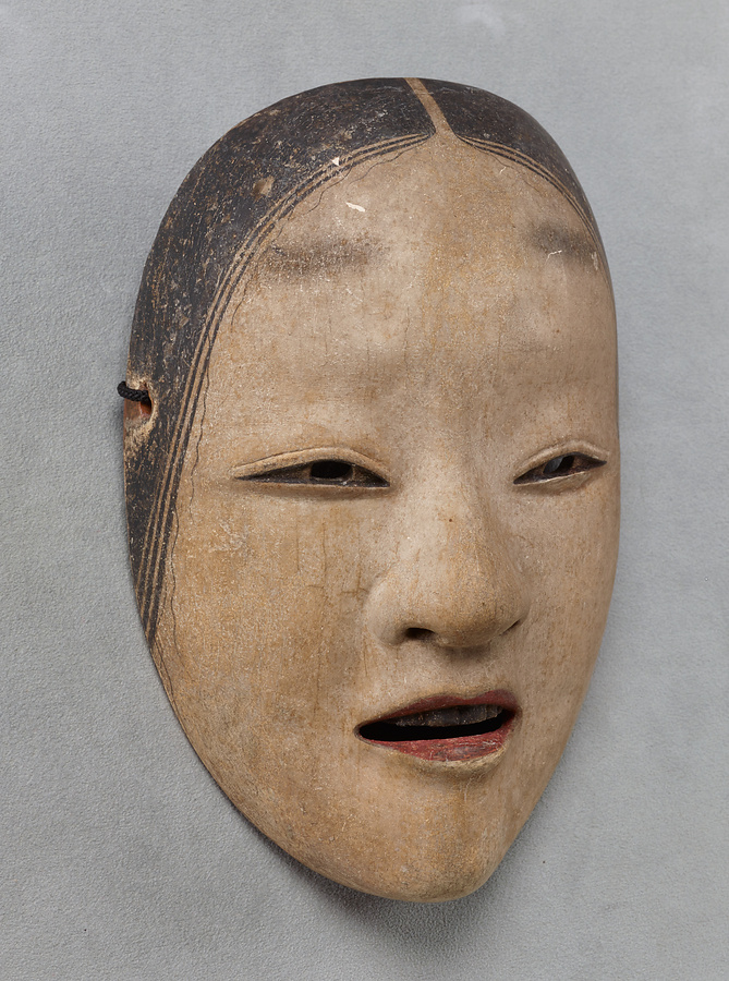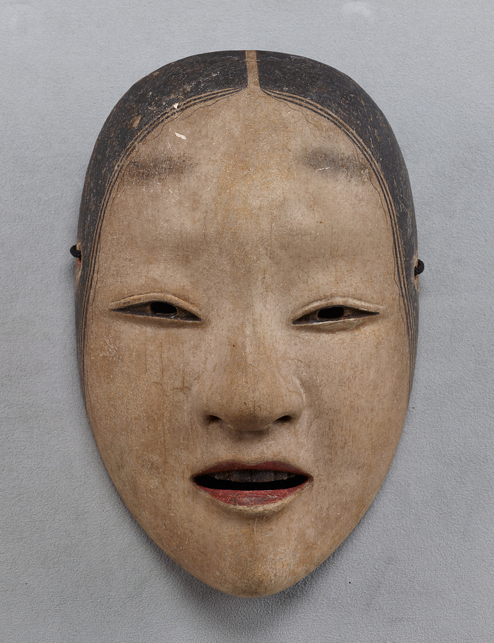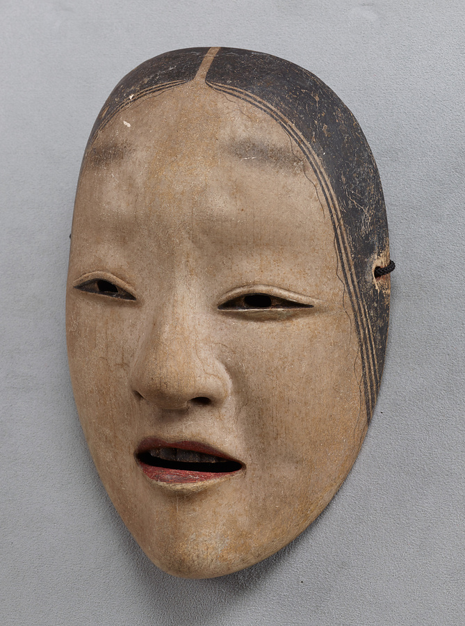 増髪は十寸髪とも書き、眉間にある左右二筋ずつの皺(しわ)とその上の大きな窪(くぼ)み、乱れた髪が特徴です。きつい表情、乱れた髪は神がかった状態を示します。女神、神霊が乗り移った巫女(みこ)、悩み苦しむ女性の亡霊の役などに用います。面裏に龍右衛門(たつえもん)作とする鑑定銘があります。
