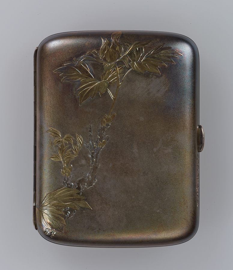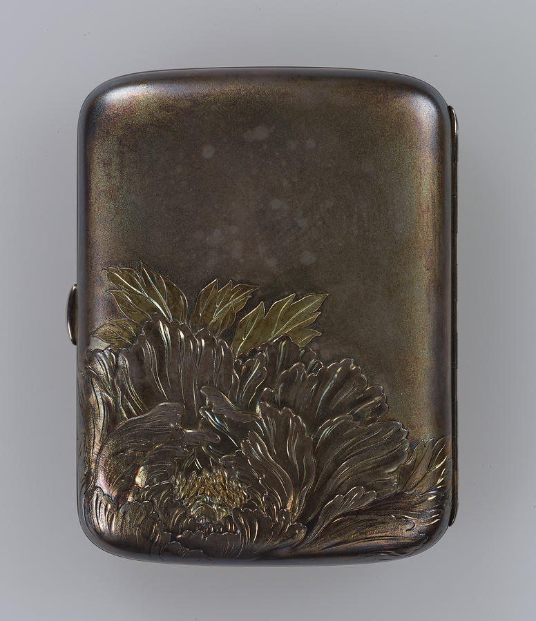 海野勝珉【うんのしょうみん】は明治期を代表する彫金家の一人で、加納夏雄【かのうなつお】に師事し、明治29年(1896)には帝室技芸員に任命されました。隅に配された牡丹【ぼたん】によって生まれた銀地の余白は、刀剣の鐔【つば】と共通する表現手法であり、立体的で克明に表された文様【もんよう】表現は、刀装技術が基盤となっています。