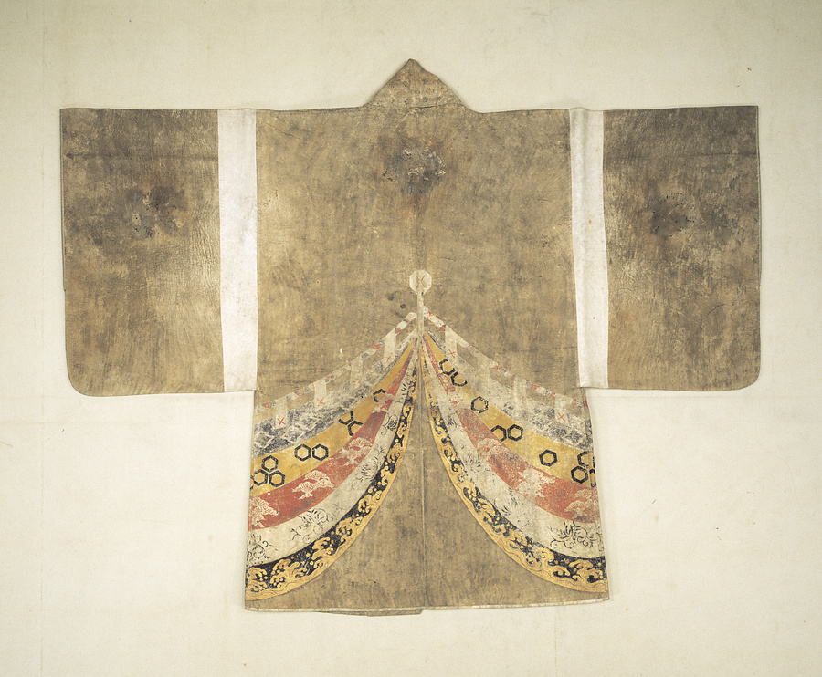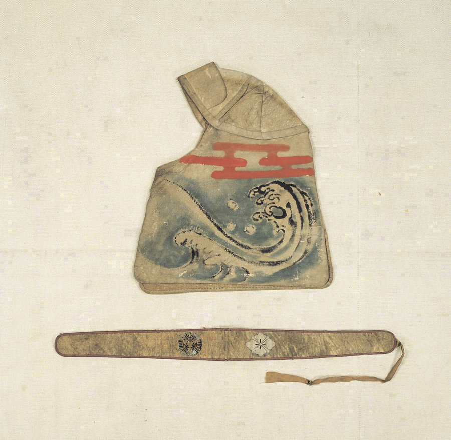 羽織(はおり)・胸当(むねあて)・石帯(せきたい)・頭巾(ずきん)からなる女性用の火事装束。羽織には幔幕の模様を、頭巾には波模様を彩色する。後世に、袖丈を長く、袖幅を広く仕立て直している。韋(かわ)製の女性用火事装束はめずらしく、製作年代が江戸時代中期まで遡(さかのぼ)る可能性がある。20091110_h081