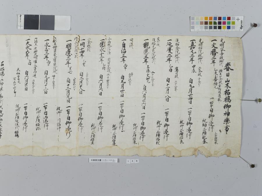 本文書は,春日社の社家(しゃけ)である大東家に伝来した文書群である。叙位(じよい)任官(にんかん)に関する口宣(くぜん)案(あん)が室町時代から江戸時代末期まで連綿として残り,また落書(らくしょ)起請文(きしょうもん),春日山木枯槁(ここう)や薪(たたぎ)能(のう)など,南都に関わる文書を含む文書群として貴重である。