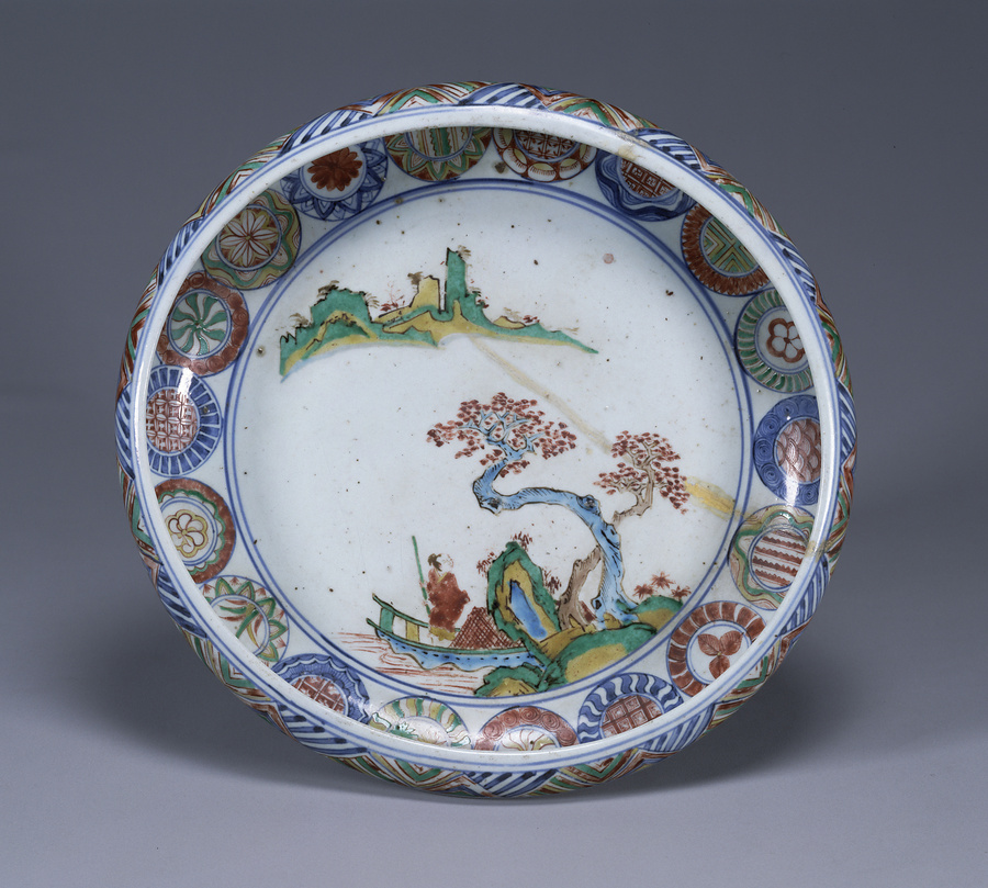 色絵山水船人物図銅鑼鉢