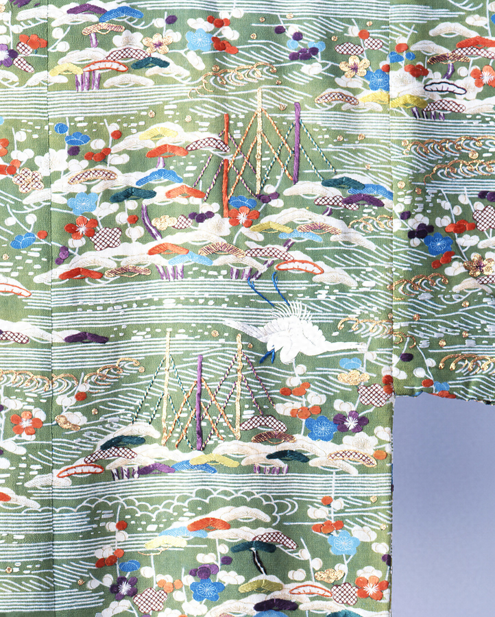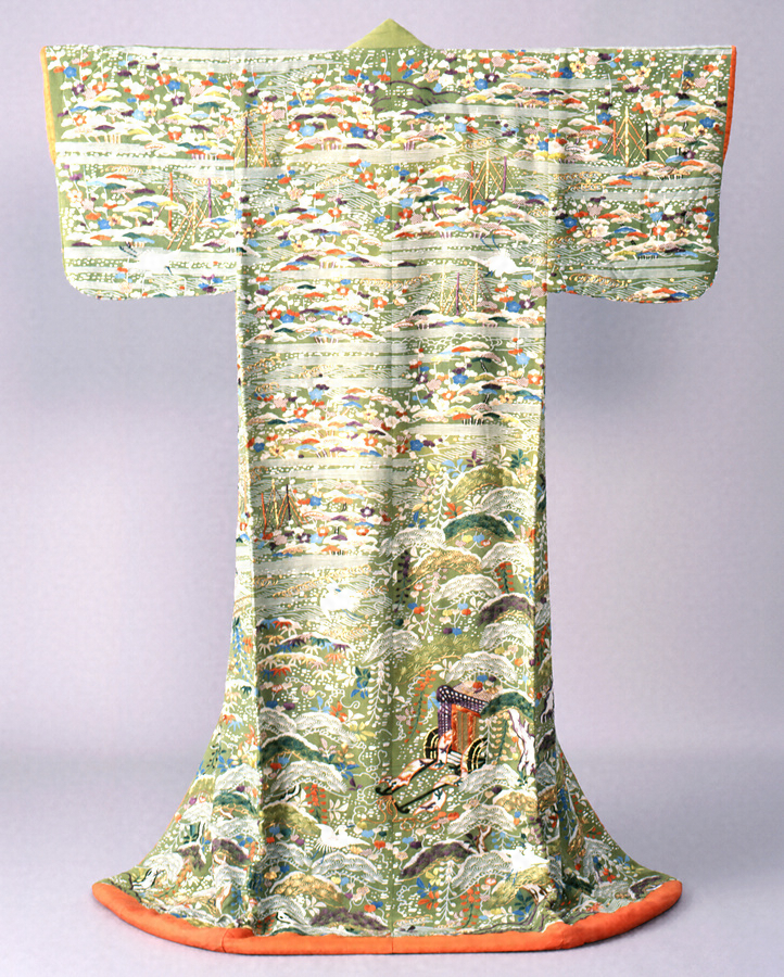 佐賀藩主鍋島家伝来の小袖。萌黄色の縮緬地に、冬景色に四季の花々を表している。裾回りには近景として、松葉の一本一本が見える松樹に藤や橘が垂れ、御所車も姿を見せる。腰部より上には松や梅、波間に網代が見え隠れする遠景が広がる。染めや縫いの豊かな彩りが全体を覆う総模様のこの小袖は、鍋島家の奥方か姫君が身にまとったものだろう。