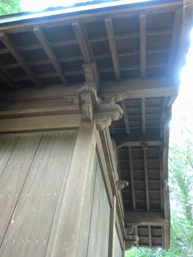 桁行一間梁間一間の正側面の床を張り出し、擬宝珠高欄を廻らして舞台とし、後方に控室を付ける。向唐破風造の照り起り屋根を架け妻入とする。兎毛通しに天狗面を彫刻し正面を飾る。内部は間仕切りに松羽目の鏡戸をたて、整った構えの神楽殿である。
