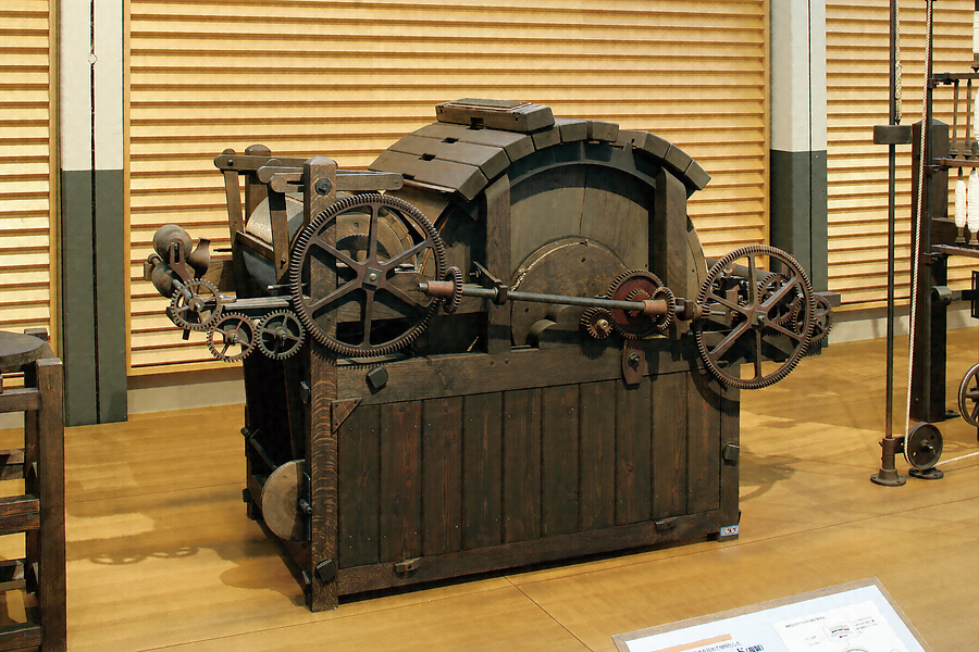 1775年イギリスのアークライトは、混打綿から精紡工程までの機械化に成功しました。その中で、綿の塊をほぐし繊維の方向をそろえる工程を梳綿といい、回転するシリンダの表面に針金を植えつけ、繊維の塊から連続的に繊維をくしけずるように動力で動かすしくみになっています。