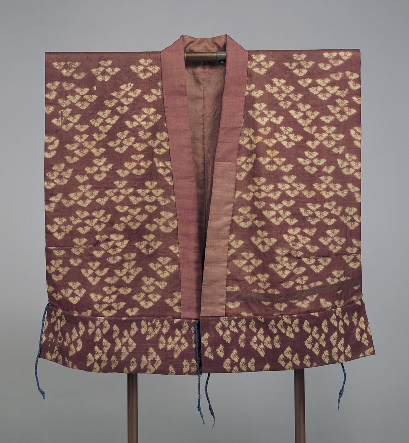 袍(ほう)と下襲(したがさね)の間に着用する、袖無・垂領(たりくび)で裾襞(すそひだ)のついた胴着です。蝶模様を凸状に彫り起こした2枚の板の間に、裂(きれ)を挟み込み、浸染すると白く蝶の模様が染め上がります。同様の裂(きれ)が当館に2枚、遠山記念館に1枚所蔵されますが、墨書にも「二十具」とあり、数多く仕立てられたことがうかがえます。