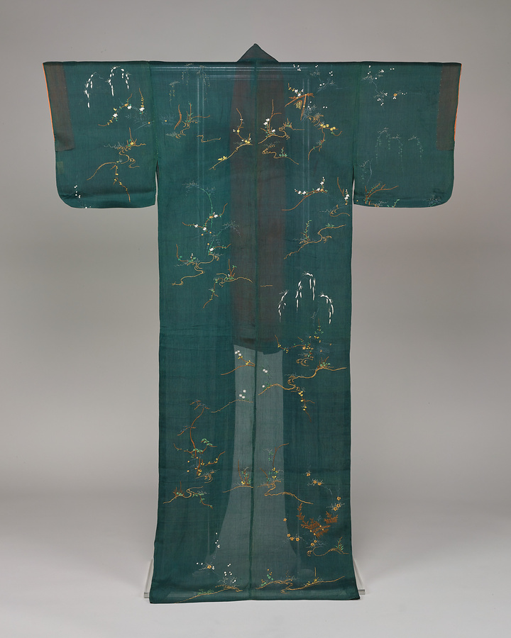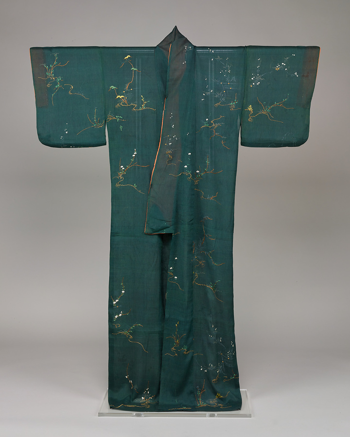 強撚糸で織り出した絹地を後練りしてたてシボをあらわした絹縮地は、汗ばむ夏にも肌触りがよいため夏季のきものに好まれました。松・梅・桔梗といった草花模様は小柄な散らし模様で刺繡のみで模様をあらわした「素縫い」です。延享~宝暦年間(1744~64)に流行しました。