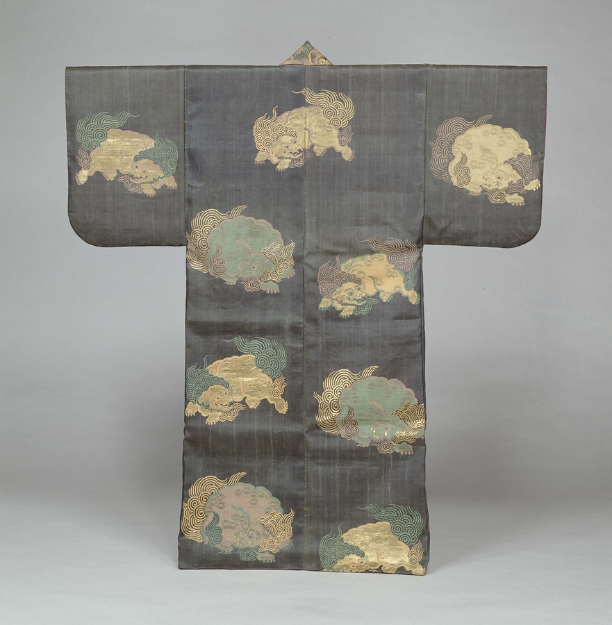 中国において獅子は百獣の王とされ、また瑞祥(ずいしょう)の1つとして古代より織物や刺繡(ししゅう)に表わされてきました。能装束では獅子の堂々とした姿態から猛々しい武将や荒ぶれた神々が着用する装束にデザインされました。特に表着の下に着用する厚板には力強い唐様の模様が好まれました。
