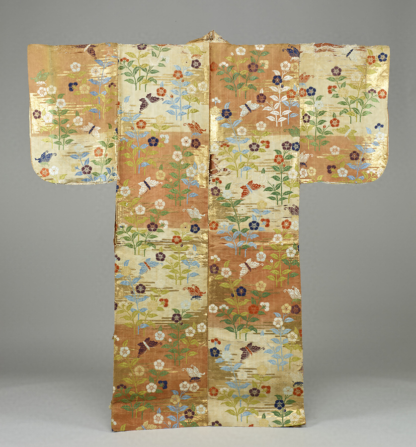 唐織は女性を演じる際に着用する表着(うわぎ)で、若い女性役には紅入(いろいり)が用いられる。紅と白を段にした地色は中世のキモノのデザイン様式を復古的に表わした能装束独特の様式である。撫子や蝶をあしらった優美な模様は貴族女性よりも里女の着流しにふさわしい。