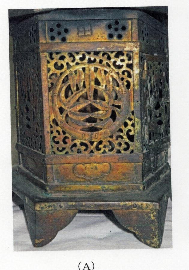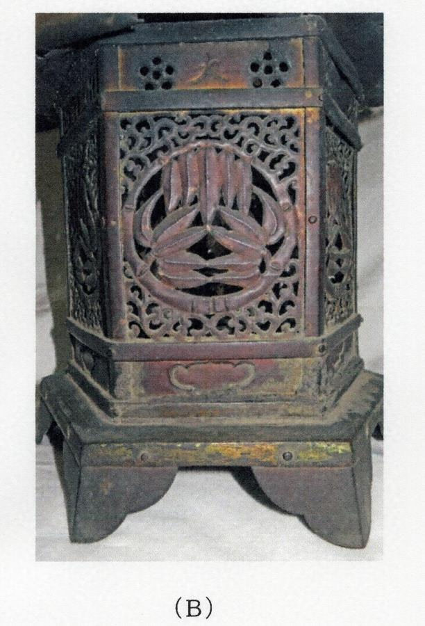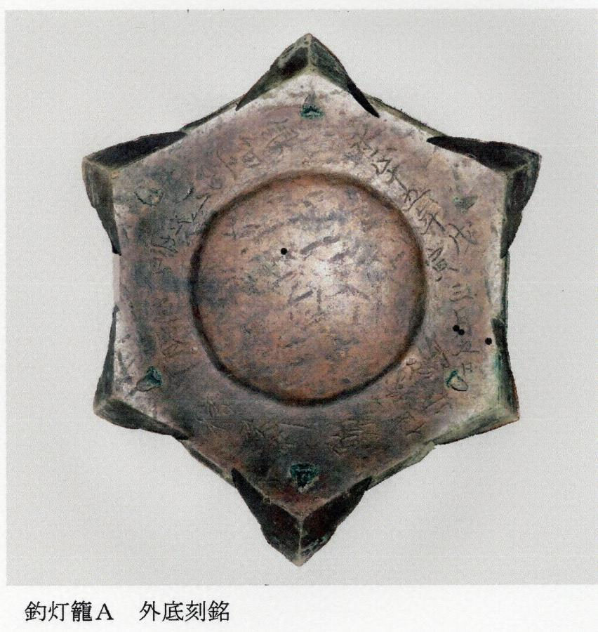 Aは透かしが平板で、格狭間も形が後出的であることから、Bよりも新しい可能性もある。とすれば、元は各々が1対以上奉懸されていた可能性が高い。Aの底には「永(えい)正(しょう)十五年 戊 寅三月五日/銀細工西川弥五郎定盛(さだもり) □寶利 家次 一族勧進 仕□」の刻銘がある。なお、Bの底板は後補である。永正十五年(1518)の年紀を底に刻むAよりも、一方のBの方が図様表現や打出しにわずかながら古様をみせることから、いま少し遡る頃より同系の金工工房で、同意匠、同形態の釣灯籠が製作され、真清田神社に奉献された可能性が高い。